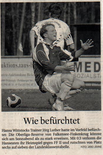 FF II gewinnt in Wittstock 3:0 / Pirschel und Nimscholz treffen In souveräner Manier konnte die zweite Mannschaft des SV Falkensee-Finkenkrug II in der Fußball-Landesklasse West beim FK Hansa Wittstock dreifach punkten. Trotz des Fehlens der Stammangreifer Morris Güttner, der nach seinem Platzverweis in der Partie gegen Friesack für zwei Spiele gesperrt wurde, und dem verletzungsbedingt noch einige Wochen ausfallenden Fabian Fritsch gelang den Falkenseern ein nie gefährdeter 3:0 (2:0)-Auswärtserfolg bei den Dossestädtern.Dem aktuellen Stürmermangel begegnete das FF II-Trainergespann Jörg Möbius und Marco Woitina mit altbewährten Mitteln. Dirk Nimscholz, eigentlich in Diensten der Altherren des Vereins, unterstützte die Mannschaft nicht nur durch seine Anwesenheit. Schon in der 12. Minute ließ er seine noch längst nicht verlorene Klasse aufblitzen und beförderte den Ball nach weitem Einwurf von Sebastian Eichhorn per Hinterkopf zur 1:0-Gästeführung in die Maschen.Auch im Anschluss erarbeitete sich Nimscholz gute Möglichkeiten, doch seinen beiden weiteren Kopfbällen verfehlten knapp das Tor (24., 38.). Zu diesem Zeitpunkt konnte FF II allerdings schon auf einen komfortablen 2:0-Vorsprung verweisen. Denn schon zuvor traf Bastian Pirschel, einer der Aktivposten im Mittelfeld, nach einem Steilpass vom soliden Libero Robin Ludwig abgeklärt ins kurze Eck (16.). Die Wittstocker, die noch über den Jahreswechsel als Herbstmeister überwinterten, strahlten nur zweimal Gefahr aus. Den Freistoß-Aufsetzer von Marcel Bock parierte jedoch FF-Keeper Sebastian Hain glänzend (23.), beim Schuss von Silvio Braun, der aus Nahdistanz verzog, brauchte er nicht eingreifen (43.).Nach dem Wechsel und dem 3:0 wiederum durch Bastian Pirschel (60.), der, nachdem Hansa-Torwart Kevin Apitz den Freistoß von Sebastian Eichhorn nur unzureichend abwehren konnte, kaltschnäuzig abstaubte, war die Partie vorentschieden. Während die Gastgeber nur noch nach einer Ecke und dem Kopfball von Christopher Haak (65.) dem Tor nahe kamen, boten sich den Falkenseern nun reichlich Konterchancen. Allein der in vorderste Front für Nimscholz eingewechselte Rosh Bahjat vergab zweimal frei auftauchend vor Apitz unkonzentriert (68., 87.). Ebenso konnten Kapitän Thomas Schult (79.), Eichhorn (80.) und Pirschel (89.) bei ihren Aktionen das Endergebnis nicht höher gestalten.Mit dem zweiten Sieg in Folge ohne Gegentor festigte FF II den neunten Platz und kann nun am Ostersonnabend das Landespokal-Achtelfinale gegen den Brandenburgligisten Eisenhüttenstädter FC Stahl locker angehen. |