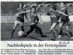 | Sa. | 15.05.2010 | 10.30 Uhr | FSV BW Rheinsberg | : | D2-Junioren | 9 : 3 |