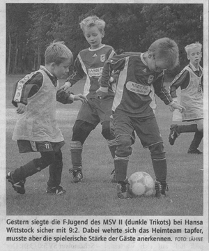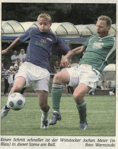 Maulbeerwalde hielt vor der Pause gut mit und bestimmte phasenweise sogar die Martie. Doch arbeitsbedingte Wechsel zur Halbzeit brachten einen Bruch ins Spiel der Gastgeber. Das nutzten die schnellen Wittstocker Stürmer und konterten erfolgreich. Tore: 0:1 Thomas Frenz (16.), 0:2 Hannes Holtmann (21.), 1:2 Mathias Neumann (28.), 2:2 Randolf Strücker (45.), 2:3 Christian Bauch (62.), 2:4 Hannes Holtmann (75.), 2:5 Christian Bauch (85.) |