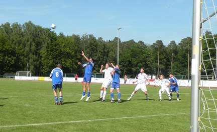 Das Wittstocker Team verschlief im Nachholespiel die erste Halbzeit gegen Kloster Lehnin, steigerte sich dann aber. Zwar ging Hansa dann sogar in Führung, musste sich am Ende mit einem 3:3 begnügen. „Der Dauerregen hat uns geschwächt“, so Co-Trainer Thomas Engel. Lehnin sei mit den Bedingungen besser klar gekommen, habe kurz und genau gespielt. Zwar hatte Braun die erste Torchance für Wittstock, doch dann nutzte der Gast zwei Chancen zur 2:0-Führung. Hansa hatte durch Christian Bauch noch einen Pfostenschuss zu verzeichnen. Nach dem Wiederanpfiff agierte Hansa engagierter. Patschenko scheiterte zunächst am Gästetorwart. Dann gelang Peter Techen per Foulstrafstoß (Foul an Silvio Braun) das 1:2 (53.). Mit einem Sonntagsschuss am Pfingstmontag markierte Benjamin Deutschmann das 2:2. Kurz danach gab der Schiri das 3:2 von Christopher Haak wegen Foulspiel nicht. Doch Haak schlug wenig später erneut zu, da hieß es dann 3:2. Einen Freistoß hatte Marcel Bock per Kopf zu Haak verlängert, der aus Nahdistanz den Ball einhämmerte. Doch Hansa jubelte zu lange, bei einem langen Ball pennte die Heimabwehr und es hieß 3:3. „Ein ganz billiges Gegentor“, ärgerte sich auch Engel. rom |