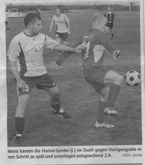 Tore: 0:1 Thomas Frenz (34.). Mit dem Auswärtssieg machte Hansa den Aufstieg in die Kreisliga perfekt. Wittstock war überlegen, hatte die besseren Chancen. Da aber das zweite Tor nicht gelang, blieb es spannend. TuS hatte mehrfach den Ausgleich auf dem Fuß. |