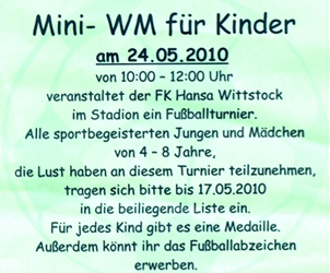 Hansa lädt Kinder ins Stadion ein Der FK Hansa Wittstock veranstaltet am Pfingstmontag eine Mini-WM für alle sportbegeisterten vier- bis achtjährigen Jungen und Mädchen. Das Ganze findet von 10 bis 12 Uhr im Stadion des Friedens in WITTSTOCK statt. Bei diesem Turnier stehen der Spaß und die Freude im Vordergrund. Jeder Teilnehmer erhält eine Erinnerungsmedaille. Die Trainer von Hansa Wittstock geben dabei auch Auskunft zu Trainingsinhalten und Trainingszeiten. MAZ |